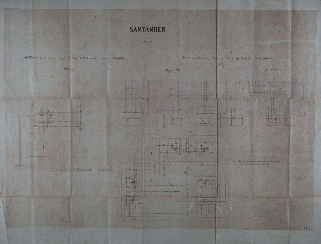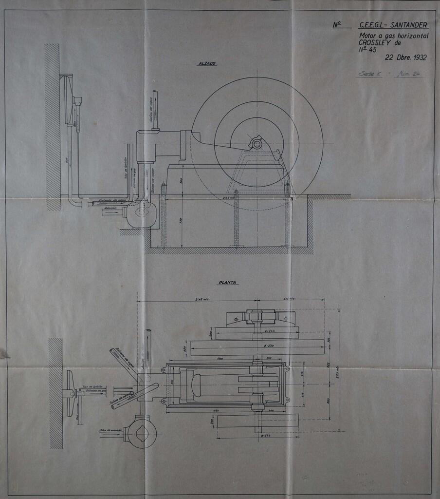 Motor a gas horizontal Crossley: alzado y planta
