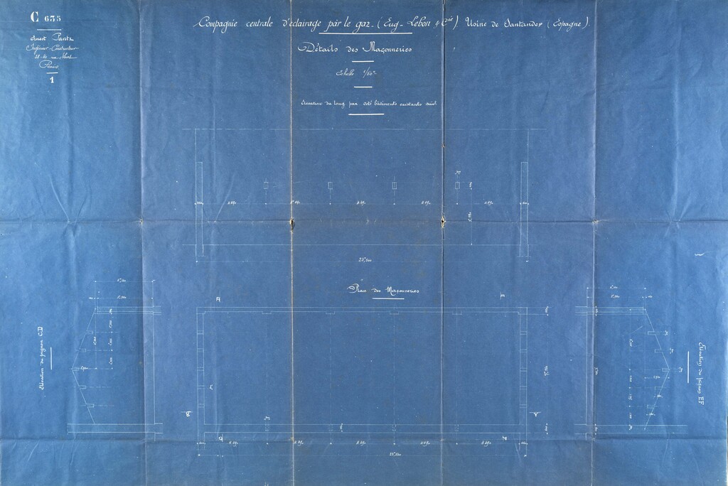 Plano del edificio central para la iluminación de gas de la fabrica de Santander: alzado y planta [1:50]