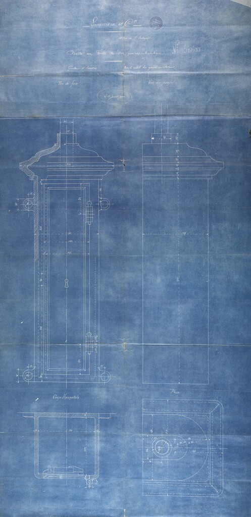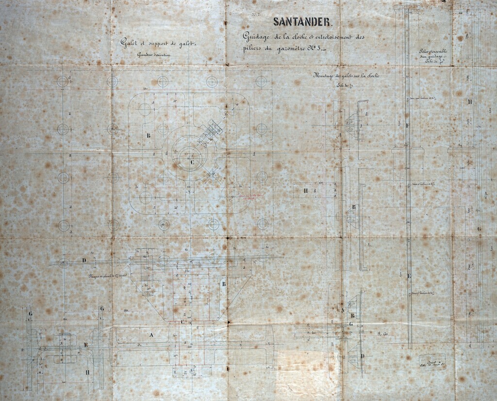 Plano del guiado de la campana y del apuntalado de los pilares del gasómetro nº3 de la fabrica de Molnedo: alzado y planta [1:20] y [1:5]